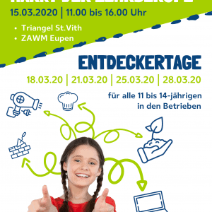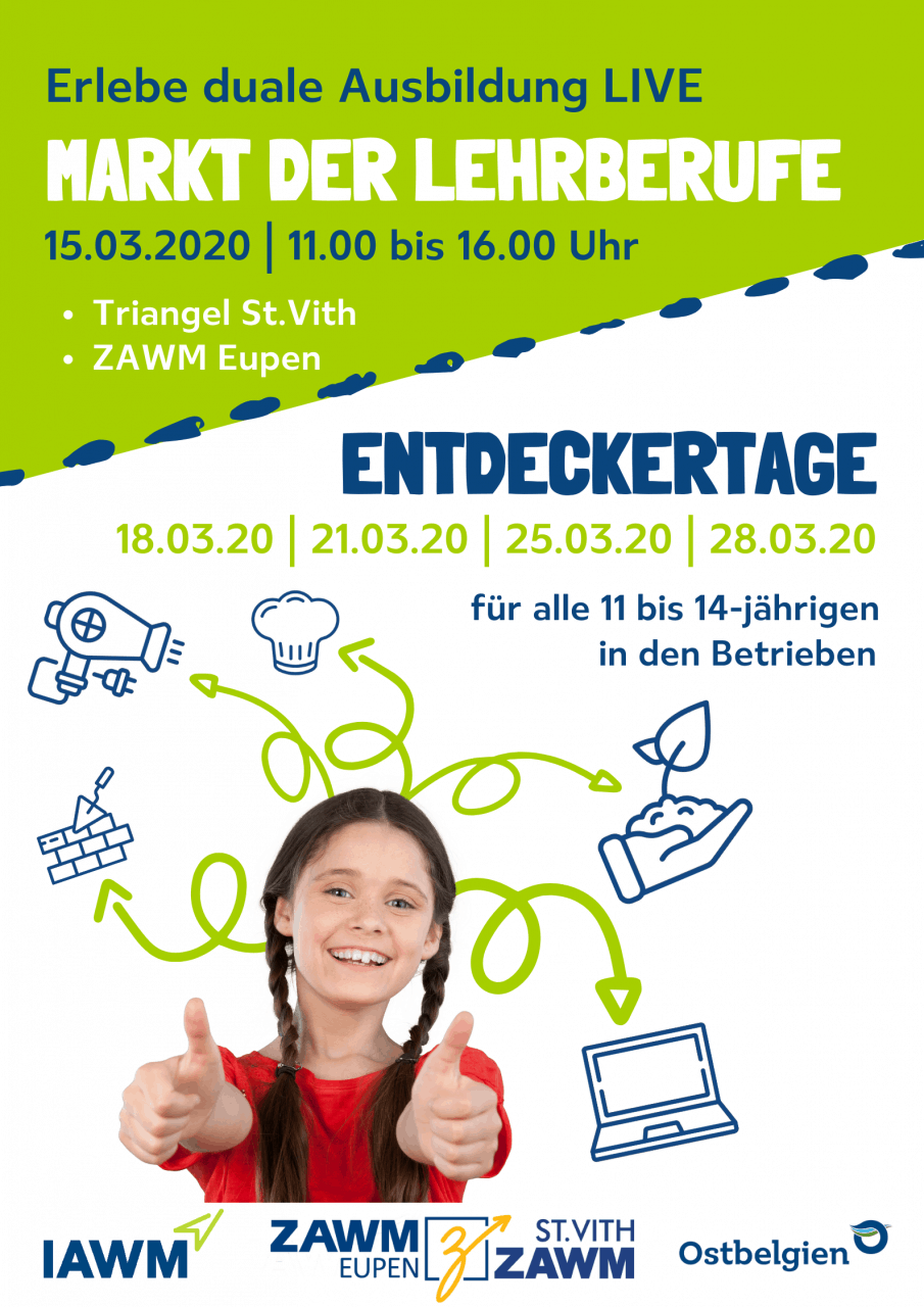 Am Sonntag, 15. März 2020 zwischen 11 und 16 Uhr, jeweils im Triangel St. Vith und im ZAWM Eupen bieten wir Kindern, jungen Menschen und ihren Begleitpersonen zum 3. Mal die Möglichkeit sich dort über Berufe, Betriebe, Lehrstellen und dem ostbelgischen Ausbildungssystem im Betrieb zu informieren. In diesem Jahr möchten wir alle Teilnehmer zum AKTIVEN MITMACHEN auffordern.