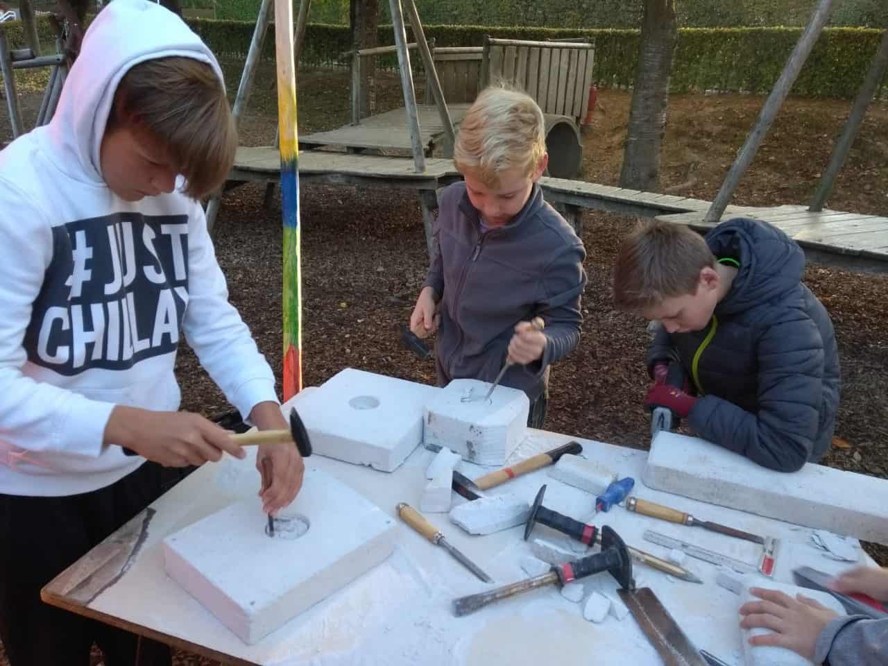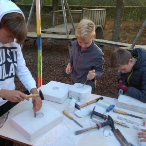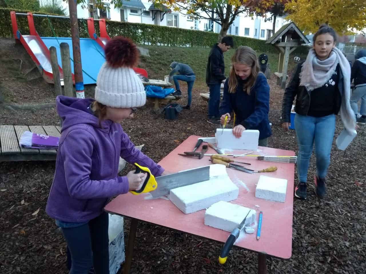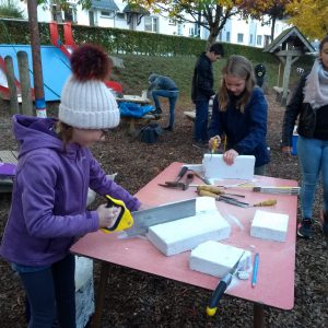 Im Oktober haben wir, das 6. Schuljahr, einen ganzen Tag mit Ytong gebastelt. Von zu Hause brachten wir verschiedene Werkzeuge mit und bearbeiteten den Stein. Wir einigten uns darauf ein Teelicht anzufertigen. Draußen war es kalt, doch wir waren so motiviert, dass unsere Gesichter glühten. Wir alle waren äußerst zufrieden mit unserem Endresultat und hoffen, dass wir bald noch einmal mit Ytong arbeiten dürfen.