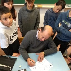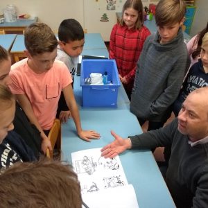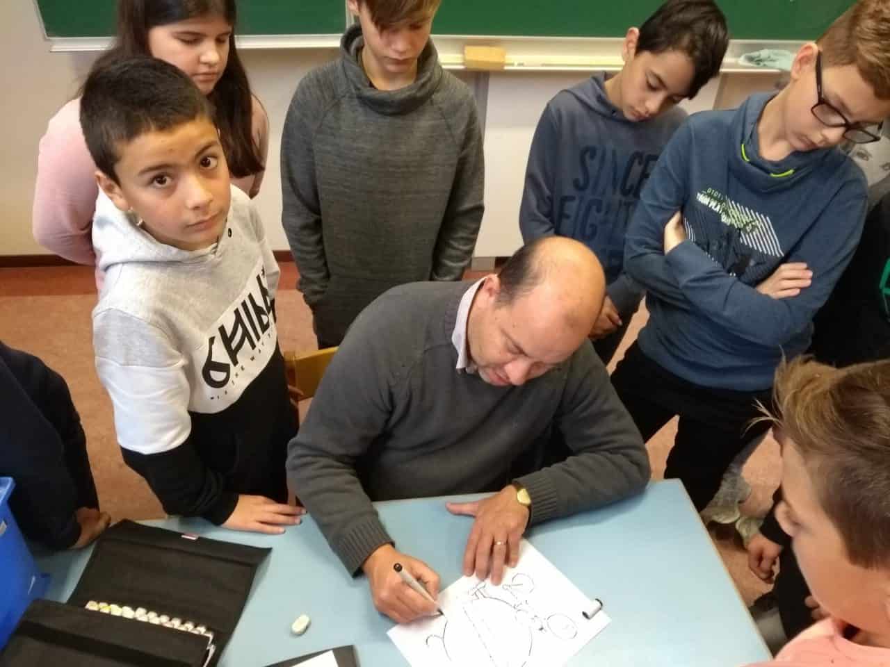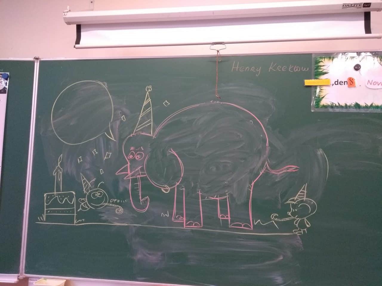 Anfang November besuchte Henry Kreklows das 6. Schuljahr. Er ist ein berühmter Comiczeichner, der uns das Zeichnen etwas näher brachte. An dem Tag haben wir viel zum Thema Comics gelernt und haben unsere ersten Zeichnungen angefertig. Henry gab uns viele Tipps und Tricks und am Ende hatte jeder einen lustigen Elefanten gezeichnet. Die Bilder kann man nächstes Jahr in einer Ausstellung in Eupen bewundern. Wir alle waren sehr überrascht, dass in jedem von uns ein kleiner Künstler steckt. Es war ein lustiger Tag, den wir so schnell nicht vergessen werden.