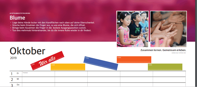Buch des Monats November ist diesmal ein A3-Familienkalender mit zahlreichen Übungen zum Trainieren der Achtsamkeit. Der Kalender ist im Anschluss an das EU-Projekt „Sonnenblume“ der Grundschule entstanden (mehr dazu auf kas-online.be/achtsamkeit).