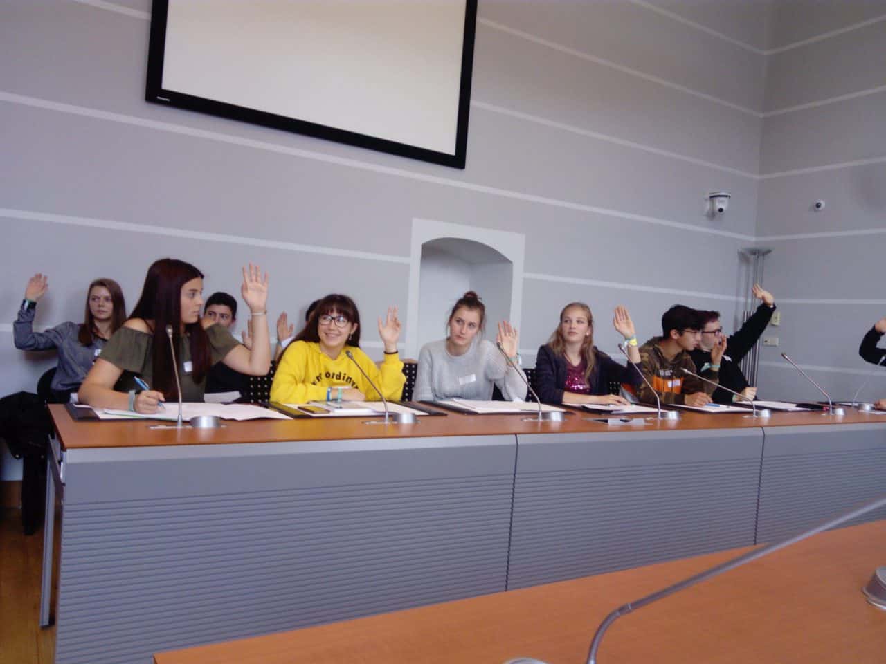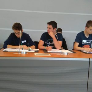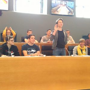 Nach dieser interessanten Erfahrung ging es nachmittags zum Parlament der Deutschsprachigen Gemeinschaft. Dort hatten die Schüler die Gelegenheit, an zwei Ateliers teilzunehmen. Beim Basismodul zum Thema „Wahlen“ wurde ihnen die Vorgehensweise des Wählens anschaulich in einem Film gezeigt, unterstützt durch eine praktische Übung, bei der die Schüler die Gelegenheit hatten, verschiedene erfundene Wahlprogramme zu studieren und dann selbst zur Wahlurne zu schreiten.