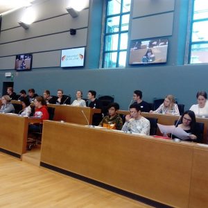 Nach dem Amtseid im Plenarsaal ging es dann ans Tageswerk: Die Schüler hatten sich vorgenommen, sich mit der Verbesserung der Mobilität in den fünf südlichen Gemeinden der DG zu befassen und zu diesem Zweck bereits einen Textvorschlag erarbeitet: Zwei Kleinbusse der wallonischen Nahverkehrsgesellschaft TEC sollten in den betreffenden Gemeinden eingesetzt werden und auf Abruf für die gewünschten Fahrten verfügbar sein. Über ein Onlineportal sowie telefonisch könnten individuelle Fahrten gebucht werden. Eine Erinnerungsmöglichkeit per E-Mail, SMS oder Anruf ist auch angedacht. Die Kleinbusse sollten dabei für alle Menschen zugänglich sein, die sich in der Eifel fortbewegen möchten. „Gerade bei Bällen am Wochenende ist solch ein Bus ideal, um nicht mit dem eigenen Auto oder dem der Eltern nachts unterwegs sein zu müssen“, argumentierte eine Schülerin. Die Gefahr von Unfällen durch Trunkenheit am Steuer könnte durch ein solches Busangebot auch reduziert werden. Einig waren sich die Schüler darin, dass das Angebot am Freitagabend sowie Sonntagnachmittag lediglich Schülern und Studenten vorbehalten sein sollte, damit man zurück nach Hause bzw. zum Bahnhof gelangen könne, um den Zug zu seiner Unistadt nehmen zu können. Auch zur Finanzierung eines solchen Modells machten sich die Schüler Gedanken: Wenn die beiden Kleinbusse von der TEC zur Verfügung gestellt würden, könnten die Fahrergehälter eventuell von den fünf Gemeinden anteilig nach der Bevölkerungszahl und in einer zweiten Phase je nach Herkunft der Nutzer aufgeteilt werden, so der Vorschlag.