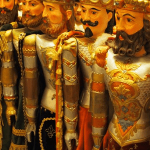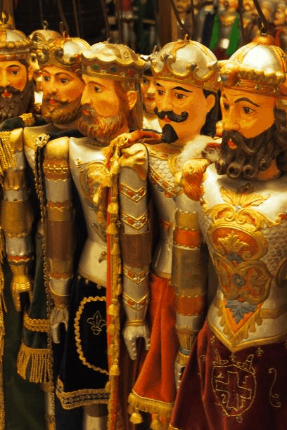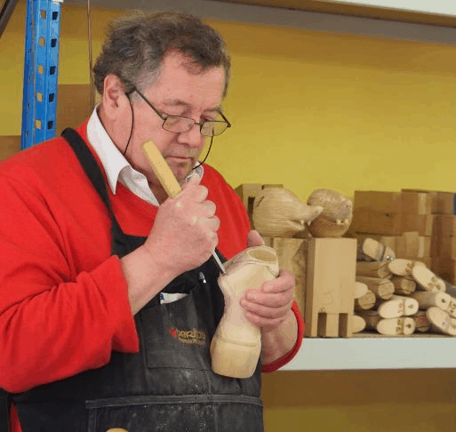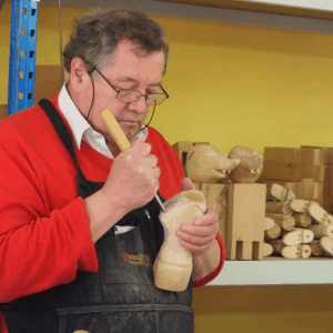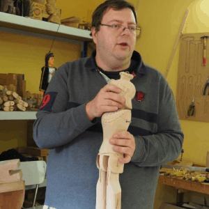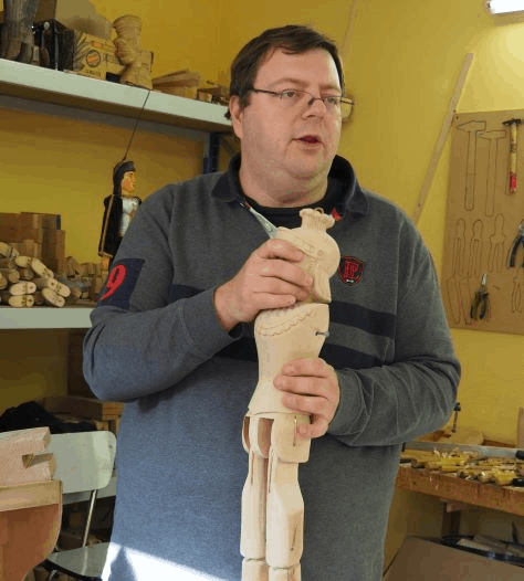 Der Lütticher Marionettenbauer Denis Fauconnier führte die Gruppe durch sein verwinkeltes Atelier. Er besitzt eine umfangreiche Marionettensammlung und zeigte sehr anschaulich, wie eine Holzmarionette entsteht. In stundenlanger Präzisionsarbeit werden aus einem Stück Lindenholz Kopf, Körper und Gliedmaße der Holzpuppen herausgearbeitet. Dann werden die Figuren bemalt und sie erhalten ein selbst geschneidertes Kostüm. Herr Fauconnier repariert hinzu alte bzw. beschädigte Puppen.