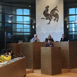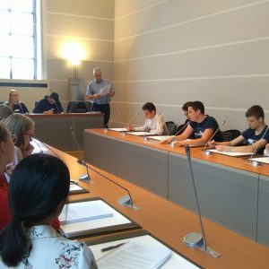 Nach einem Mittagsimbiss ging es dann mit den in den Ausschusssitzungen erarbeiteten Änderungsvorschlägen am bestehenden Dekrettext zur Vorstellung und Verteidigung in den Plenarssaal, wobei ebenfalls lebhaft ausgetauscht wurde. Ein Abschiedsgeschenk in Form eines Buchsgutscheins rundete den Tagesbesuch des Parlaments der Wallonie ab.