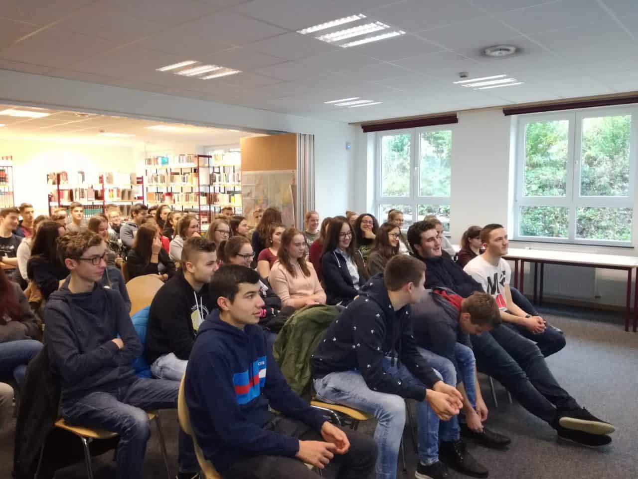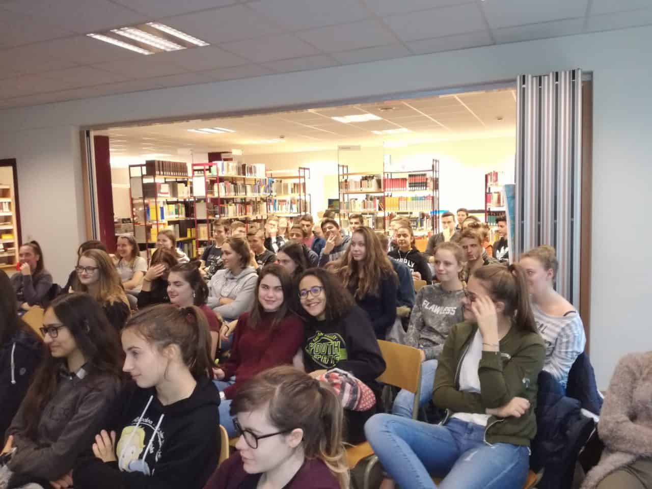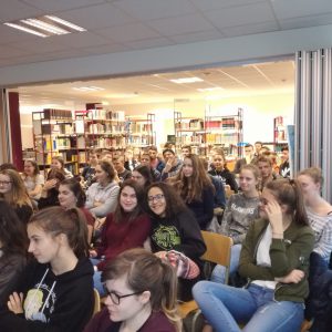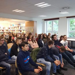 Alle 6 Wochen besucht das 5. Schuljahr die Pfarrbibliothek St.Vith. Die Schüler dürfen sich hier 1-3 Bücher aussuchen und diese dann für 6 Wochen ausleihen. Dabei sollen die Leselust und das stille Lesen gefördert werden. Vom Athenäum aus machen wir uns gemeinsam auf den Weg in die Bibliothek. Dort angekommen, suchen die Schüler selber ihre Bücher aus. Dabei unterstützen sie sich gegenseitig mit Tipps oder lassen sich von den Bibliothekarinnen und Fräulein helfen. Vollgepackt geht es dann wieder in die Schule zurück. Hier verteilen sich die Schüler in der ganzen Klasse auf Decken, Jacken, Stühlen oder unter den Tischen und lesen in ihren neuen Büchern. So leise ist es sonst nur selten im 5. Schuljahr. 😉