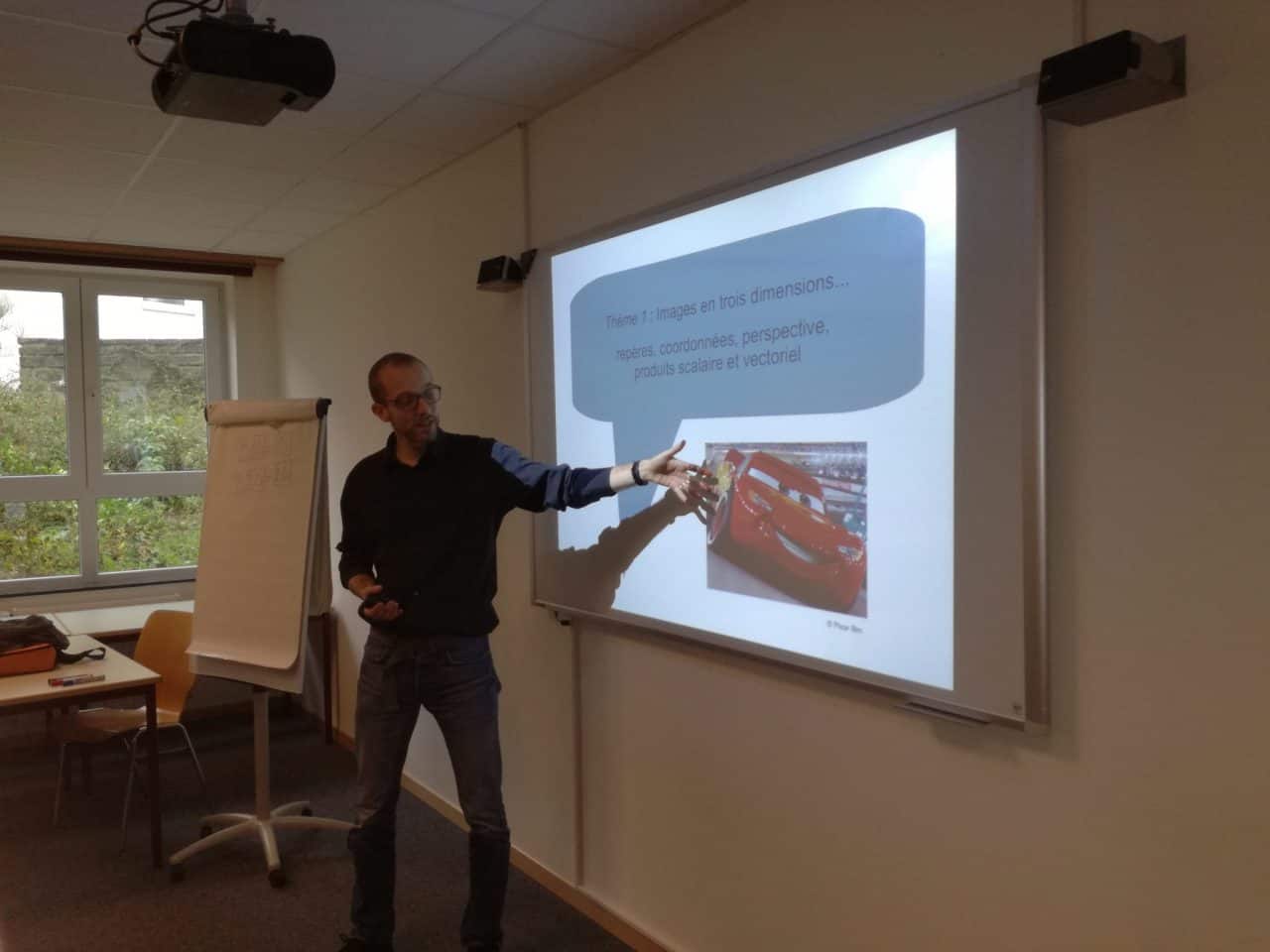 Le but de cet exposé est de présenter, à travers plusieurs exemples simples, des outils mathématiques utilisés dans la conception de jeux vidéos (par exemple : projections, produits scalaire et vectoriel, calcul matriciel pour l’animation en 3D, fonctions et fractales pour la création de textures procédurales et de matériaux, etc.). Les exemples étaient choisis en fonction des connaissances préalables des élèves (analyse, algèbre, géométrie) et ont permis de mettre en évidence l’utilité en infographie des concepts vus au cours de mathématique.