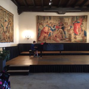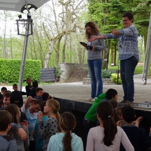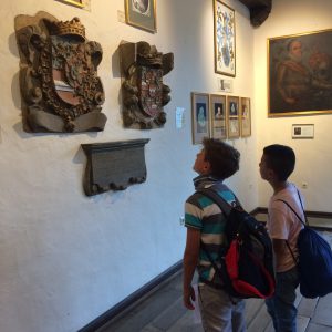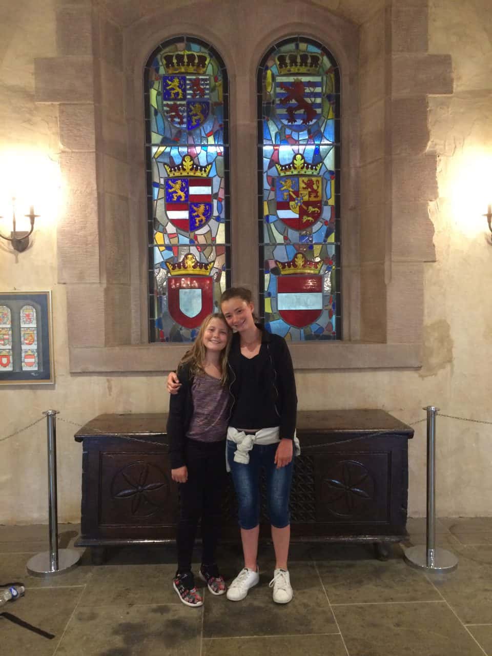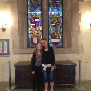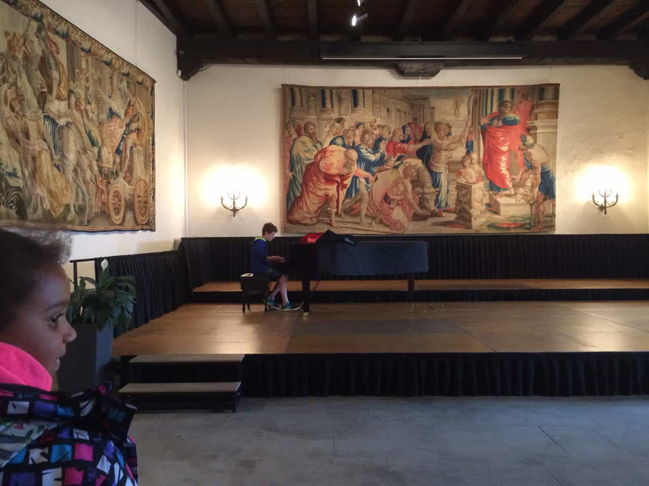 Nachdem die Schüler erst selbst mit Hilfe eines kleinen Spurspiels die Burg erkunden durften, picknickten wir aufgrund des ’nassen‘ Wetters in der Cafeteria. Anschließend folgte eine sehr interessante mit vielen Anekdoten gespickte Führung durch und um die Burg herum. Im Festsaal durfte Andreas seine Lieblingslieder auf dem Flügel sogar zum Besten geben.